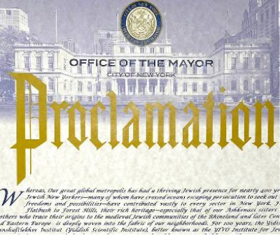 Mayor Eric Adams and Congressman Dan Goldman presented YIVO with proclamations in honor of its Centennial.