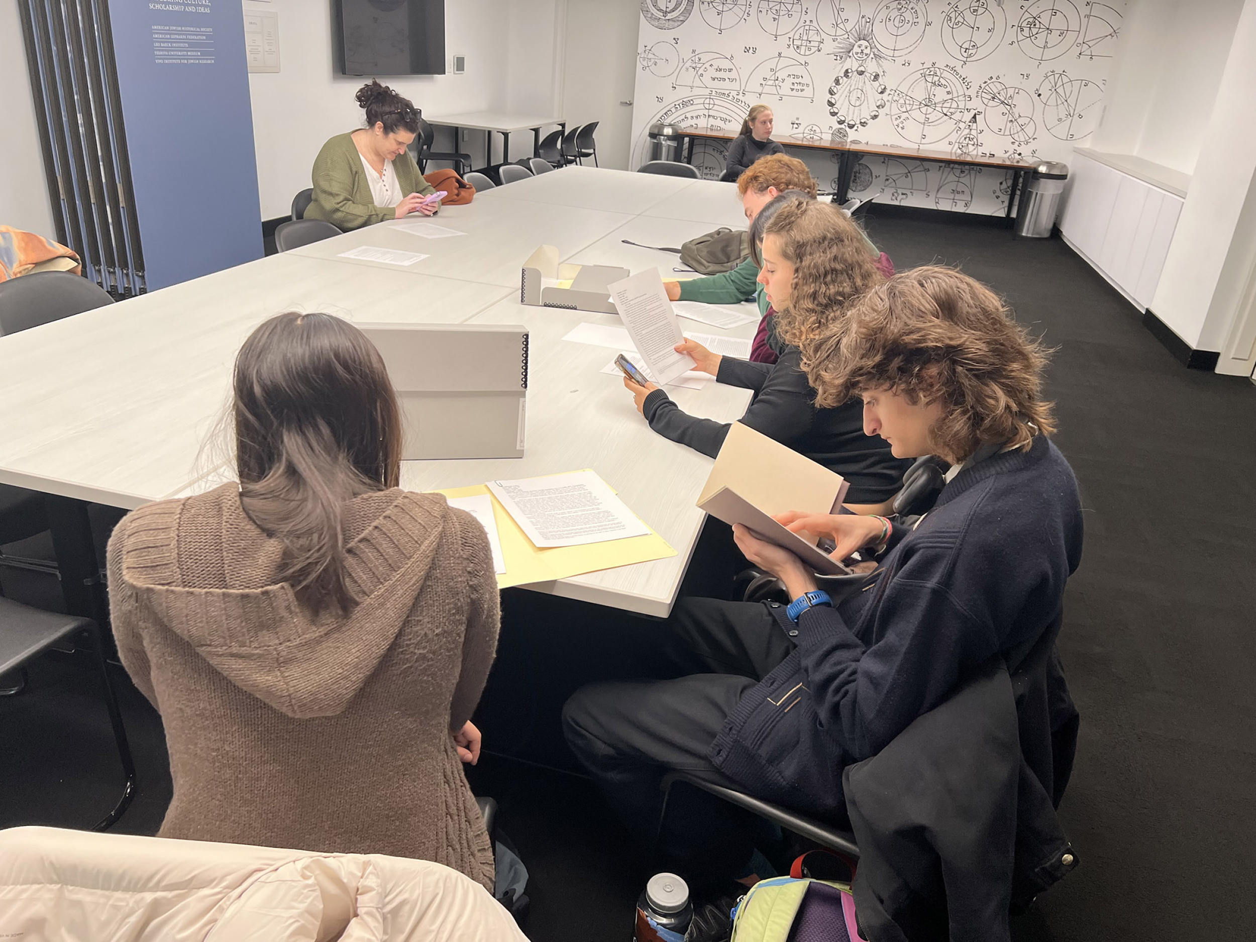 On November 17, YIVO hosted a beginner Yiddish language class from Columbia University. The class was brought to YIVO by Graduate Instructor Ethan Fraenkel, an alum of YIVO’s Uriel Weinreich Summer Program. During their visit, the group was given a presentation about YIVO’s history, a tour of archival stacks led by Halpern, and a chance to peruse the YLMC’s archival lesson kits. During the last section, they tested their Yiddish knowledge by trying to read the archival reproductions in their original Yiddish.
